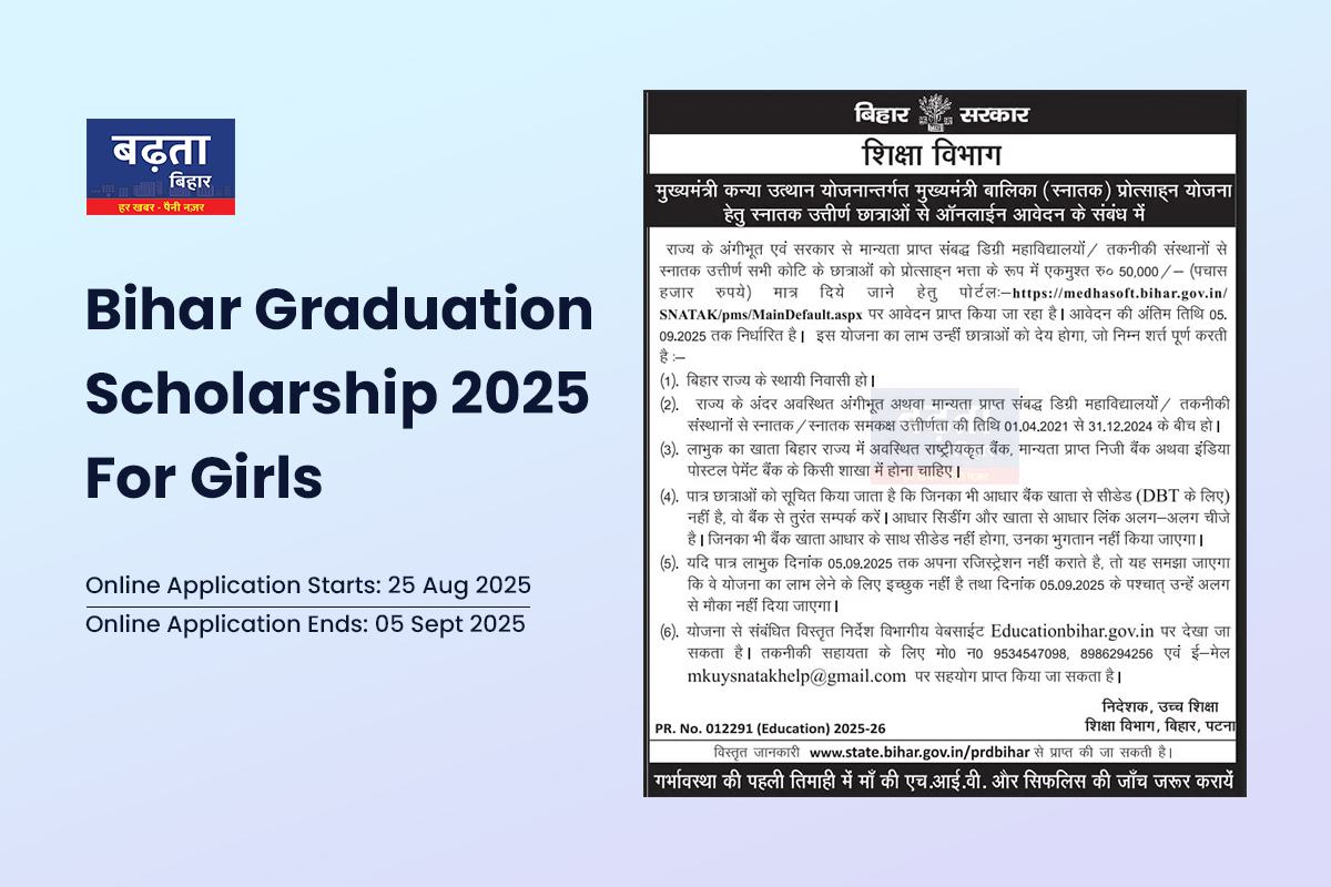 Bihar Graduation Scholarship स्कीम बिहार में महिला शिक्षा को प्राथमिकता देती है और लगभग 5 लाख लड़कियों तक पहुंचने की उम्मीद है। पोर्टल पर ऑनलाइन लिंकिंग 05.09.2025 तक ही उपलब्ध रहेगा। तत्पश्चात् पोर्टल लिंक स्वतः बंद हो जाएगा। तत्पश्चात् आवेदन स्वीकार नहीं किए जाएंगे। अतः दिनांक 05.09.2025 के पश्चात् पुनः आवेदन करने का मौका नहीं रहेगा।